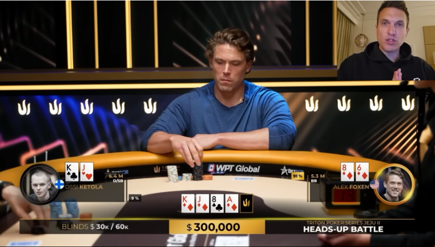 这手牌发生在传奇扑克超豪赛济州站·国王(Monarch)单挑赛,由芬兰豪客新秀 Ossi Ketola 对阵顶尖高额桌职业牌手 Alex Foxen。比赛规则很简单:Winner Takes All —— 谁赢谁带走全部奖金。