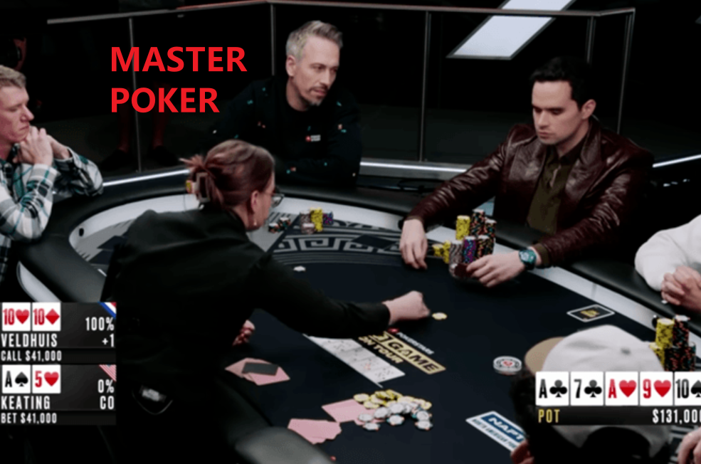牌局中,Veldhuis 在早期位置以 10♥10♦ 开局加注至 $1,200,Keating 拿着 A♠5♥ 三下注到 $4,000,翻牌发出 A♣7♣A♥,Keating 立即击中三条 A。Veldhuis 连续两条街选择过牌并跟注,分别面对 $5,000 和 $15,000 的下注。